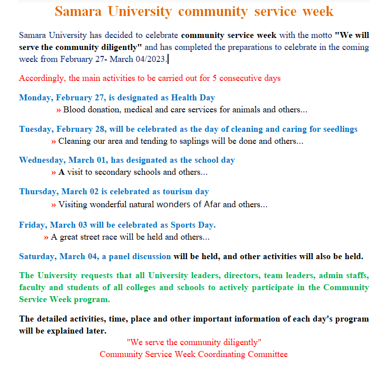June 16, 2023 Samara University community service weekSamara University community service week Samara University has decided to celebrate community service week with the motto “We...