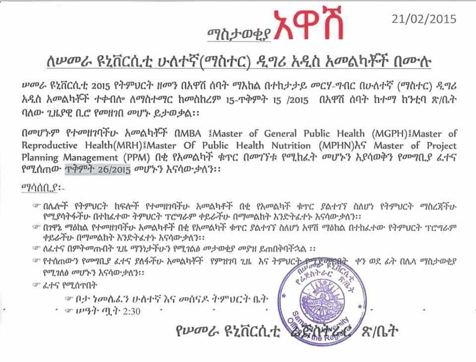 የሰመራ ዩኒቨርስቲ በአዋሽ ፤ በአይሳኢታና ባቲ ማዕከሎች በ2015ዓ.ም ማስተር ፕሮግራም ለማስተማር ባወጣው ማስታውቂያ መሰረት ያመለከታችሁ አመልካቶች በቂ አመልካቾች የተገኙበትን ፕሮግራሞች ለመክፈት የመግቢያ ፈተና የሚሰጥበት ቀን ጥቅምት 26/2015 መሆኑን አውቃችሁ ከዚህ በታች በተለጠፈው ማስታወቂያ ላይ የተገለፀውን የመፈተኛ ቦታ ላይ ተገኝታችሁ እንድትፈተኑ እንገልፃለን።