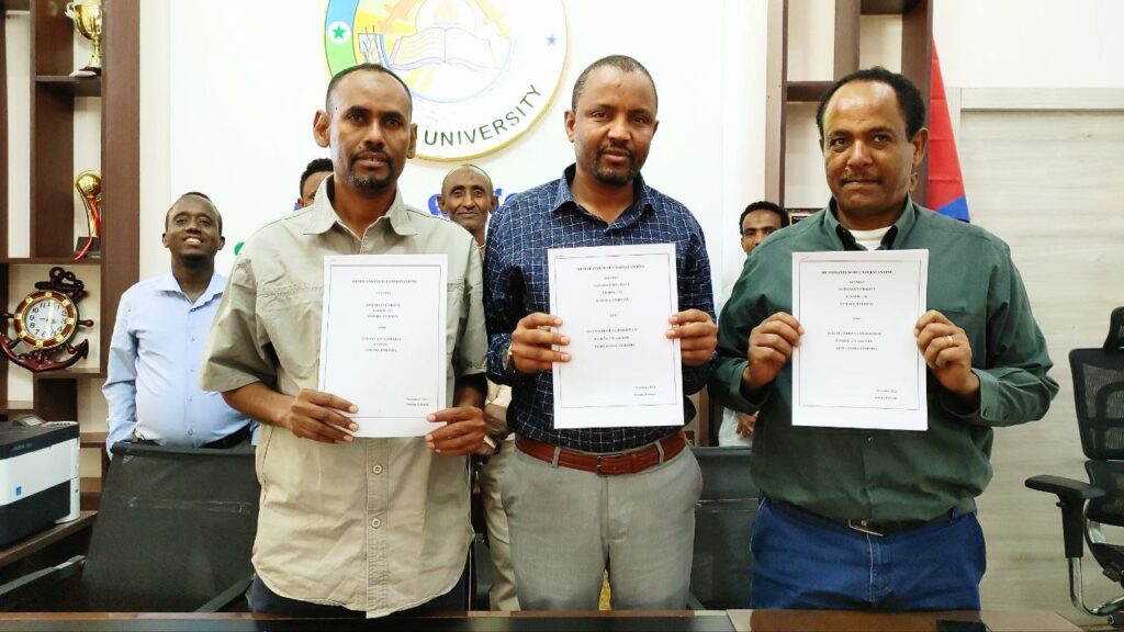 ፊርማውን የዩኒቨርሲቲው ፕሬዝዳንት ዶ/ር መሀመድ ኡስማን የPelum Ethiopia Consortium ዳይሬክተር ዶ/ር ሃይላይ እና የገዋኔ ግብርና ቴክኒክና ሙያ ስልጠና ኮሌጅ ዲን አቶ መሀመድ ሀመዱ በዩኒቨርሲቲው በመገኘት ተፈራርመዋል፡፡
